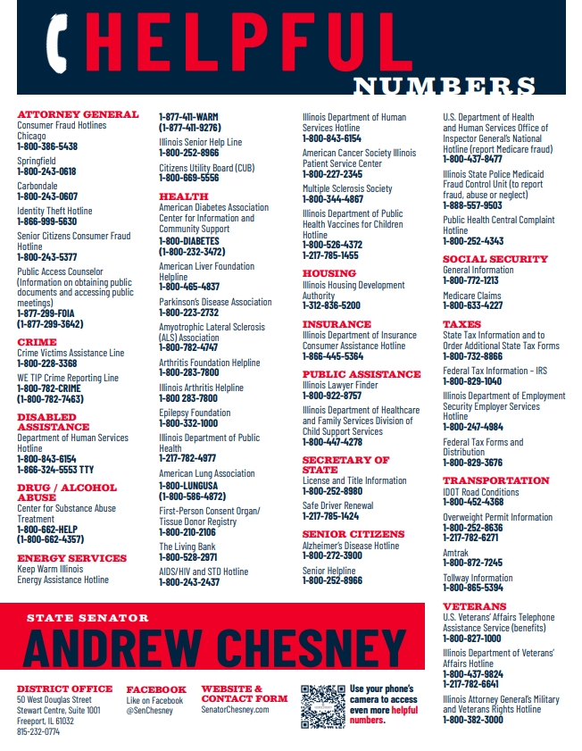 State Senator Andrew Chesney (R-Freeport) is partnering with Winnebago County Sheriff Gary Caruana on Wednesday, September 6 for a 6:30 PM Tele-Town Hall Meeting.